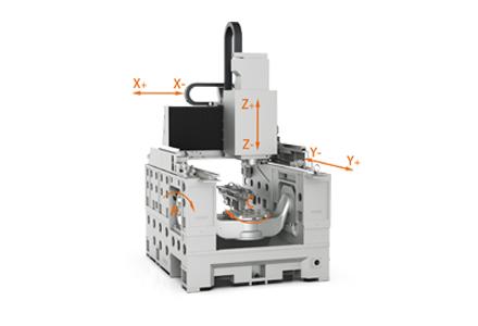 FMC-600V 五轴加工中心整体采用龙门式结构,双立柱高架结构,Y轴采用双驱结构,并配置AC轴摇篮式回转工作台,可一次装夹完成铣、钻、扩、镗、攻、锪等多工序的高精、高效加工。